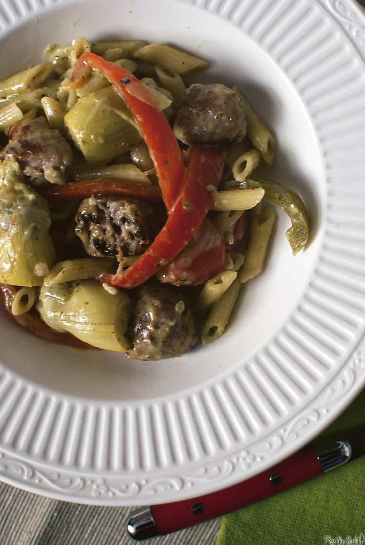 A cozy one-pan pasta loaded with Italian sausage, artichokes, and peppers simmered in a creamy white wine sauce. Simple, flavorful, and ready in about 30 minutes — the kind of weeknight dinner that tastes like you actually tried.